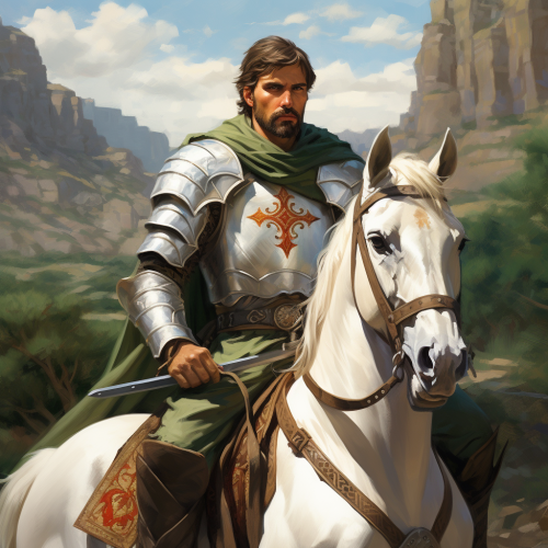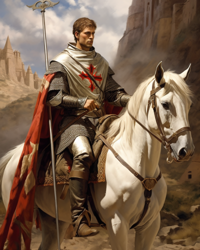 full body portrait, handsome knights Templar on horseback, white armor, brown short hair, green eyes, leather Templar boots, dungeons and dragons style--ar 4:5