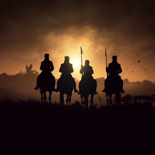 silhouettes of FOUR knights in horses, standing at the edge, looking at the crowd of people cheering below them, in a vast, dark, sunrise environment --v 5.0 --s 750