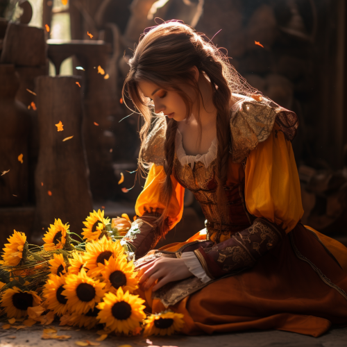 She is kneeling on the ground with her hand trashing out, shooting out magical flowers from her palms. Her brown hair is pulled up in an updo and she has side swept bangs on her forehead. She has tears In her eyes as she is concentrating very hard on shooting magic sunflowers flowers from her hands. She is wearing an orange and yellow fantasy medieval dress