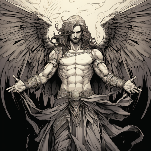 Medieval fantasy comic book line art style. male figure with wings for hands covering his body