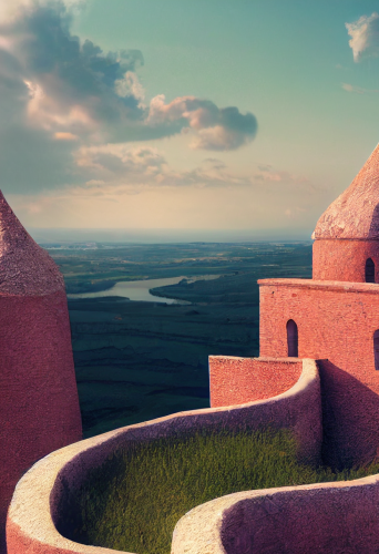 medieval houses built on the ledge of rock 774 metres above sea level, overlooking the red River valley. Surrealist, national geographic cover page, 64 K, Ultra-Wide Angle, Depth of Field. Octane render, Intricate details, very realistic. --testp --ar 64:128 --s 5000 --upbeta