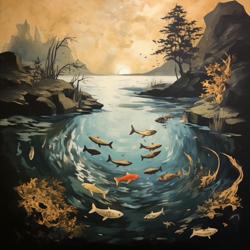 Style of Medieval Bold brush stroke acrylic painting , the lake with dead fishes floating and occultic symbol made by dirts beside the lake