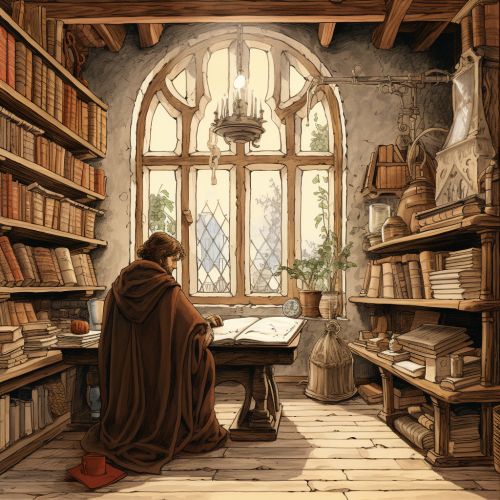 medieval book illustration of a room in a medieval monastry with a young monk sitting at a writing desk, in the background bookshelves with books lying horizontally on the boards