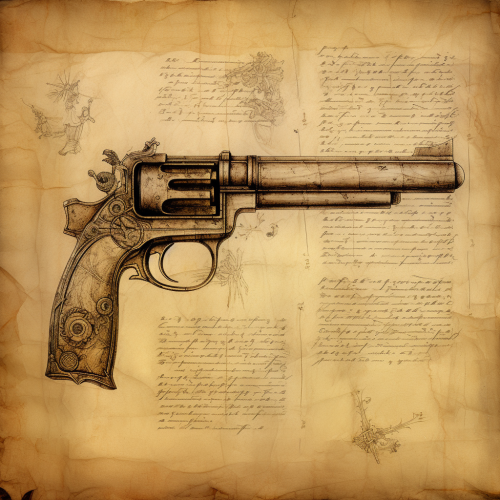An original pistol on a parchment background, in the medieval fantasy style, in the style of beksinski