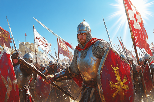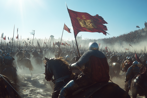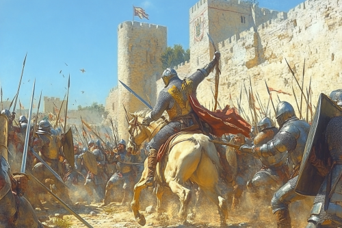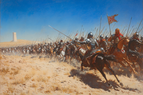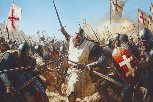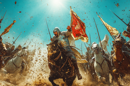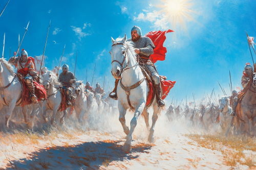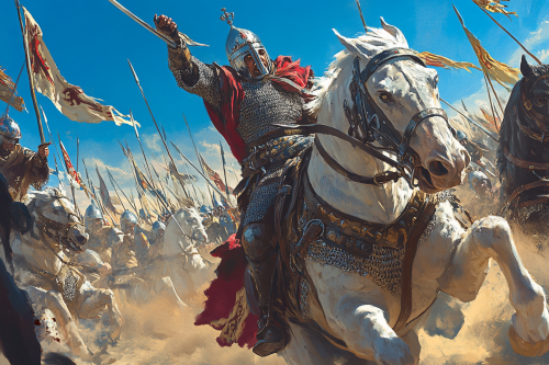 a realisitc 19th century painting of King Baldwin IV of Jerusalem leading his knights with and intense Frenzy and focus at the battle of Montsigard against Saladin and his men under a blazing sun and clear blue sky --ar 3:2