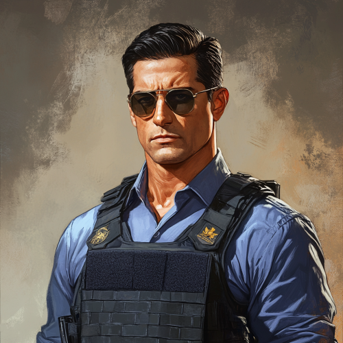 a CIA agent wearing a blue button up shirt with a plate carrier protective vest over it, he has black slicked back sleezy hair and is wearing aviator glasses
