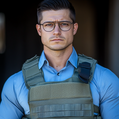 a CIA agent wearing a blue button up shirt with a plate carrier protective vest over it, he has medium length black slicked back hair is wearing aviator glasses