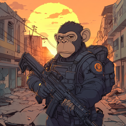 a cartoon chimp in futuristic battle armor with a valorant style battle rifle standing on a broken street with delapedated building behind him and setting sun