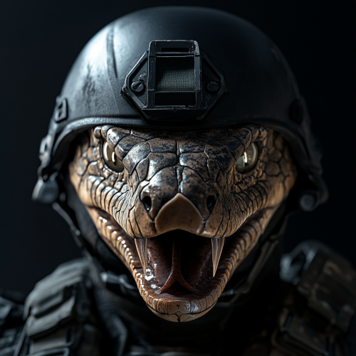 An angry cobra showing its fangs, wearing a black military tactical helmet, dressed in call of duty, with gunpowder on its face, no noise, soft shadows, front face photo --v 6.1