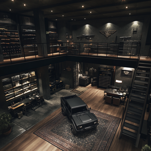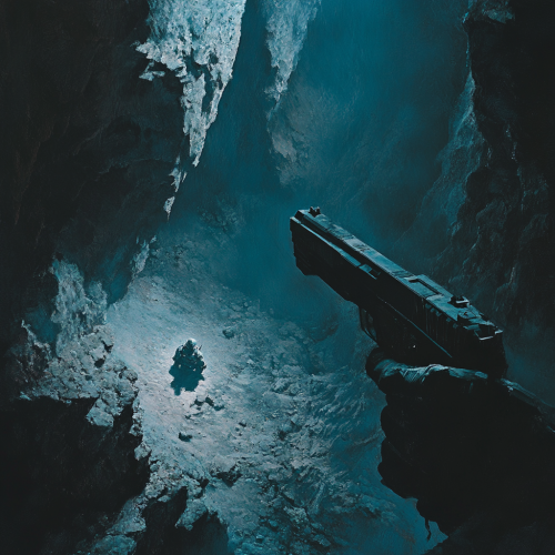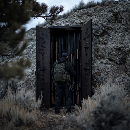 a man discovers a vault door in the side of a mountain in montana back country. Within the door is a dark themed modern weapon room full of rifles --style raw --v 6.1