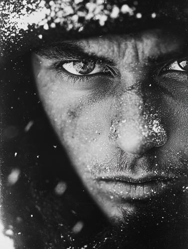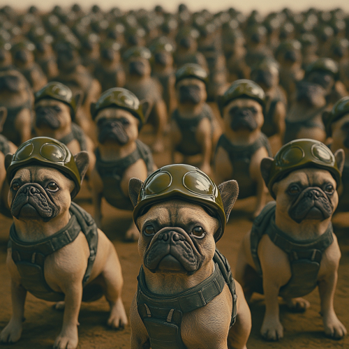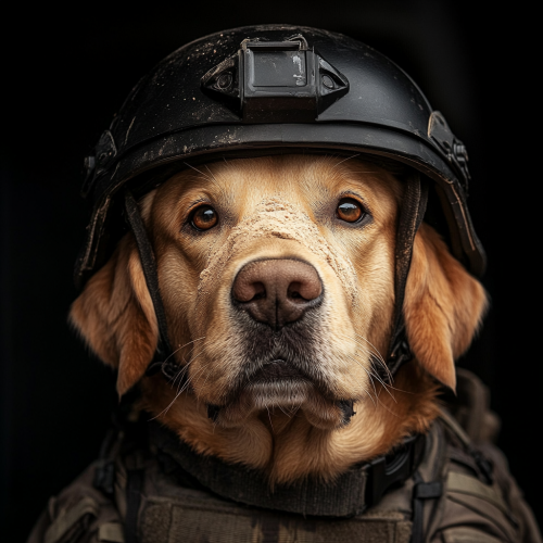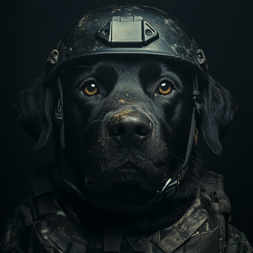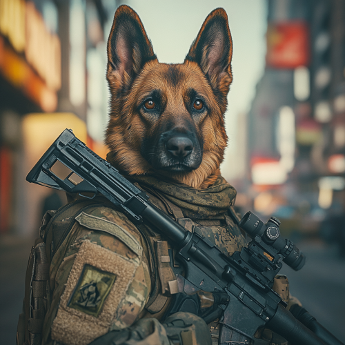 The image depicts a German Shepherd dog wearing a military uniform and holding a gun. The dog appears to be in a destroyed city, as evidenced by the rubble in the background. The dog's expression is sad, adding a touch of emotion to the scene. The focus on the dog's face is slightly blurry, giving a sense of movement or action. The subject of the image is the dog, portrayed as a soldier in a war-torn setting. The medium is a digital image with a resolution of 1024x1024 pixels. The environment is a destroyed city, emphasizing the theme of conflict and destruction. The lighting appears dim, adding to the somber mood of the scene. The predominant colors are muted grays and browns, reflecting the bleakness of the setting. Overall, the composition of the image is striking, with the juxtaposition of the dog in a military uniform and the ruined city creating a sense of unease and tension. The image evokes a mix of emotions, from sympathy for the dog's expression to unease at the implications of a dog armed in a war setting, professional photograph.