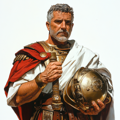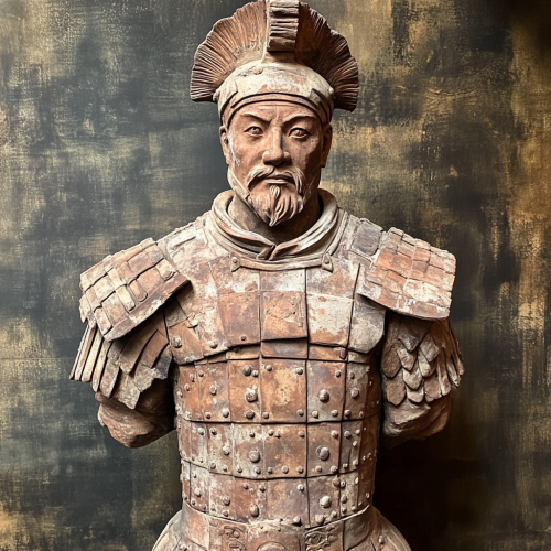 A terracotta warrior styled as a roman centurion, historical artist, ancient craftsmanship, detailed armor, regal expression, fusion of Roman elements, weathered texture, commanding presence, intricate facial features, historically inspired, cultural blend, majestic stance, timeless artistry