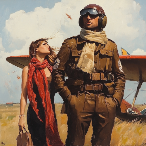 classic jack vettriano style painting of ww1 pilot standing by his plane, scarf blowing in the wind, googles resting on his helmet, woman hanging on v 6.1