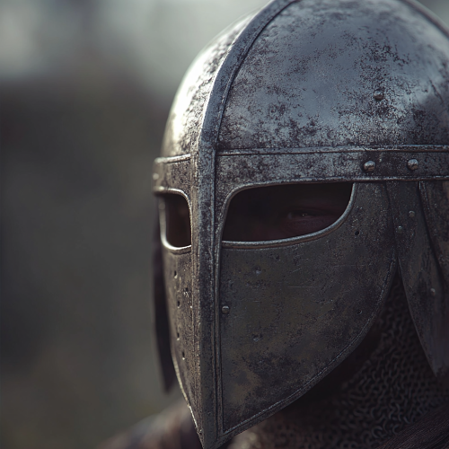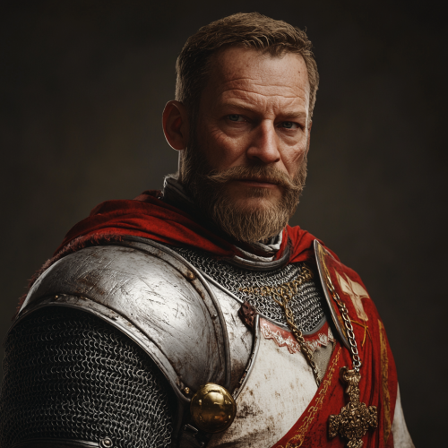 male warrior in his late 40s early 50s, experienced knight. Aristocratic, bearded, well groomed, wearing polished chain mail and plate aromour and red and white clothes.