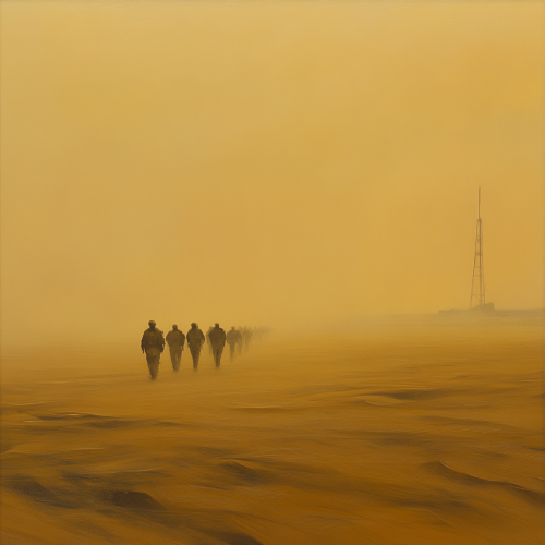 a barren windswept planet, yellowish in colour, there is an army unit standing in parade formation barely visible in the mist, the ground is flat, there is a small power generating facility in the distance
