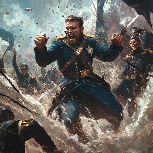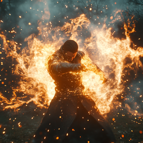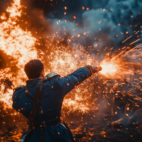a dramatic shot of a man in the middle of a war, wearing a blue uniform, shooting a huge stream of flame out of his hands into oncoming attackers. The attackers are engulfed in flames. Cinematic quality. Highly detailed. Action, battle, war.