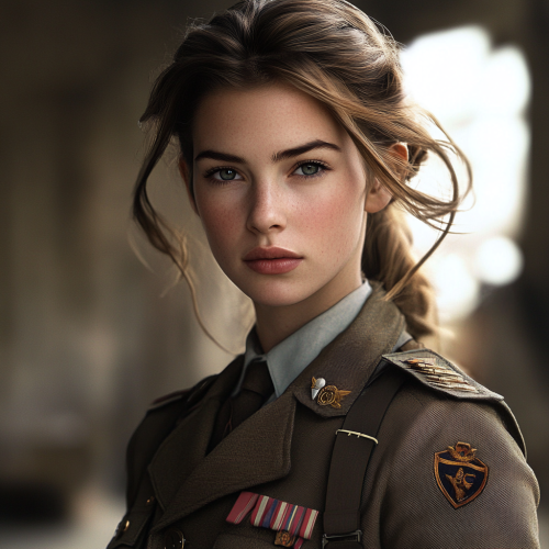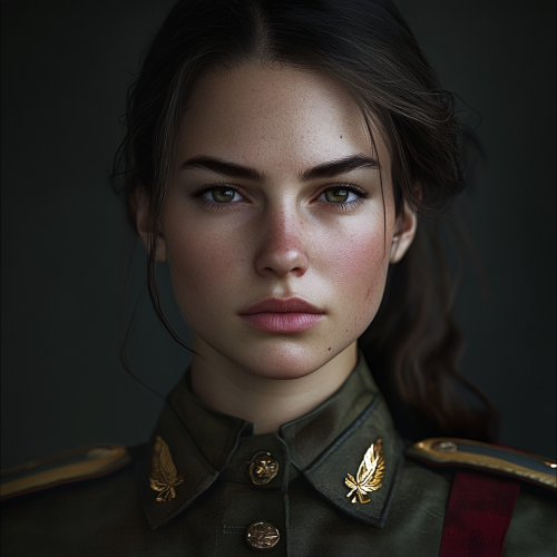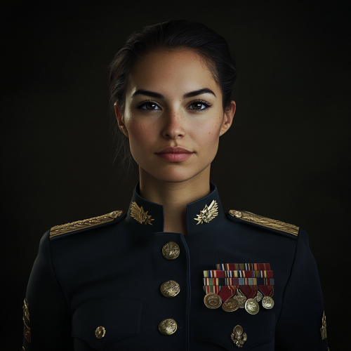 hyper realistic photo of Isabelle military. Her sharp gaze and defined features spoke of a long career. Her immaculate and proud posture reflected deeply ingrained discipline and rigor.