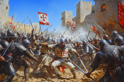 a 19th century realistic lanscape painting of the battle of Montsigard with 100s of crusaders with swords and shields fighting 100s of arab muslims with scimitars.The sun blazes in the clear blue sky above. King Baldwin IV of Jerusalem, age 16, is cut by a scimitar while he is focused and frenzied --ar 3:2