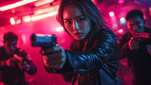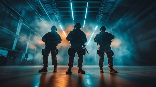 album cover, In the future hangar, three special forces soldiers, fully armed and majestic, with a cinematic lighting atmosphere, chasing lights shining on people, and dramatic frontal shots, captured with a Sony Alpha A7R IV, lens canon EF24 - 70mm f/ 2. 8 LVSM II, 8K, --ar 16:9