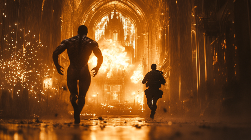 alien xenomorph very muscular running with a soldier side by side inside giant church with explosion on the background, at night with rain --ar 16:9 --s 250
