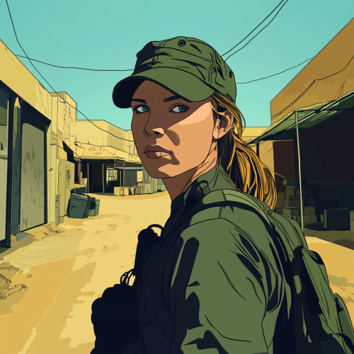 A simple artistic cell shaded illustration of a modern day female soldier who’s face looks like a mix between Amanda Tapping and Scarlet Johansson with brunette hair she is in a urban desert setting cautiously walking through a empty market place