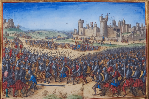 a 19th century realistic lanscape painting of King Baldwin IV of Jerusalem, age 16, on his horse, leading his men into the battle of Montsigard with 100s of crusaders with swords and shields. The sun blazes in the clear blue sky above. --ar 3:2