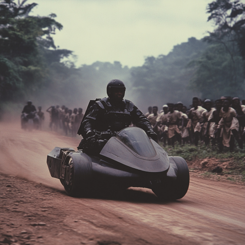 A panoramic photograph taken in 1989, a tall black male modern special forces marine riding a futuristic hoover motorcycle down dirt road in with white colonial people on each side of the road.