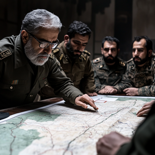 Description: Chamran studies a large map on a table, surrounded by senior officers. His finger traces potential attack routes, showcasing his strategic mindset. Visual Details: Close-up on the map with annotations. The expressions of concentration and respect from the officers should be highlighted.