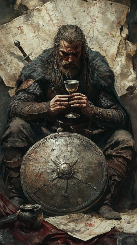 Illustration of Attila the Hun surrounded by reminders of his hardships, a battered shield, empty goblet, and torn maps around him, his expression weary but resolved, gritty textures and shadowy tones adding depth to the reflective scene --ar 9:16 --v 6.1
