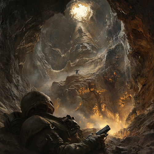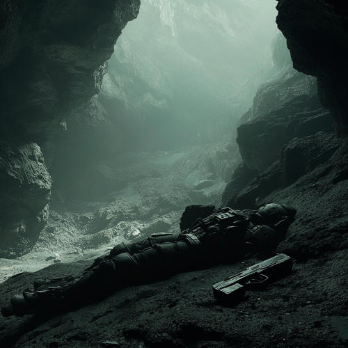 Wide shot of a dark, expansive cave with a towering, rocky hill at its center. At the top of the hill lies the body of a Chinese soldier in worn power armor inspired by the Fallout universe, with a dim glow reflecting off the armor’s edges. Next to the soldier’s outstretched hand rests a pistol, partially covered in dust. The cavern is shadowy and atmospheric, with a sense of ancient decay and mystery, faint light filtering through cracks above, casting eerie shadows across the rocky landscape.