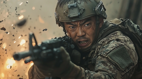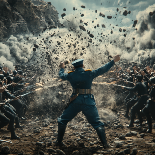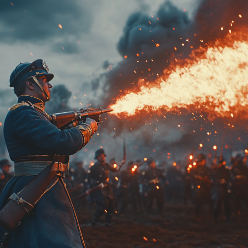 a dramatic shot of a man in the middle of a war, wearing a blue uniform, shooting a huge stream of flame out of his hands into oncoming attackers. The attackers are engulfed in flames!! Cinematic quality. Highly detailed. Action, battle, war.