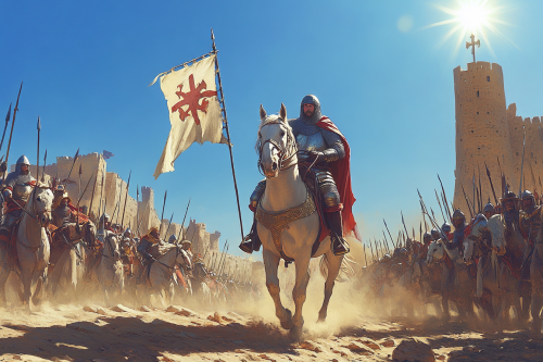 a 19th century realistic lanscape painting of King Baldwin IV of Jerusalem, age 16, on his horse, leading his knights into the battle of Montsigard with 100s of crusaders. The sun blazes in the clear blue sky above. --ar 3:2