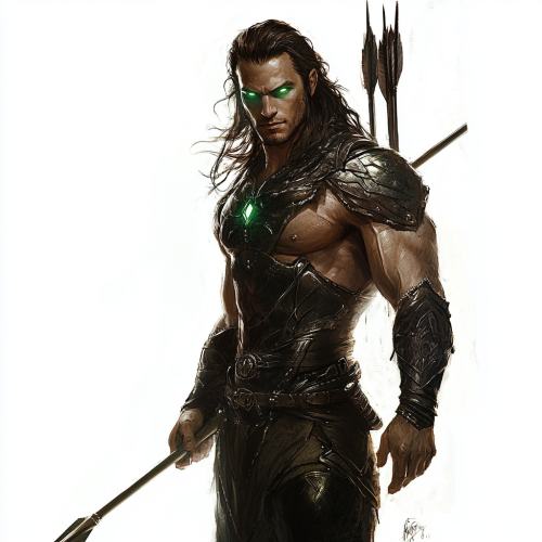 Empty white background, with a male warrior. glowing emerald green eyes. He should be a fit muscular man dressed in sleek leather armor with long hair. Have him holding a simple but fierce spear in one hand. He should look intimidating. Keep his size small enough that he only takes up the center third of the vertical space.