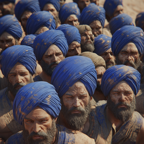 50 Sikh warrior heads, most with blue turbans, some young and some old, all turbaned, piled up into a 5 foot tall pyramid shape. A little dirt on their faces and eyes mostly closed. They’re in a sandy wasteland. Realistic. Cinematic. 16:9