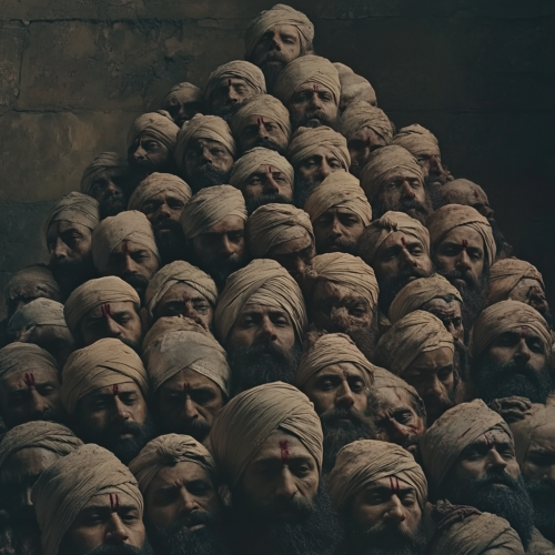 Sikh warrior heads piled up into a pyramid shape, killed after a battle against Abdali in Punjab in 1762. No tilak on forehead. Realistic. Cinematic. 16:9