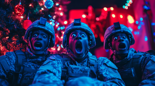 Album cover style, three shocked soldiers, neon blue, behind them some christmas decorations, captured with a Sony Alpha A7R IV, lens canon EF24 - 70mm f/ 2. 8 LVSM II, 8K, --ar 16:9