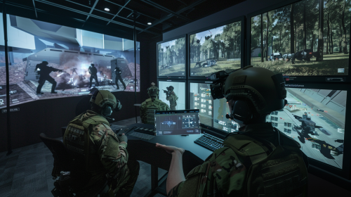 concept rendering of a training center for military and police that uses Virtual Reality, Touchscreens and interactive technologies. --ar 16:9 --v 6.0