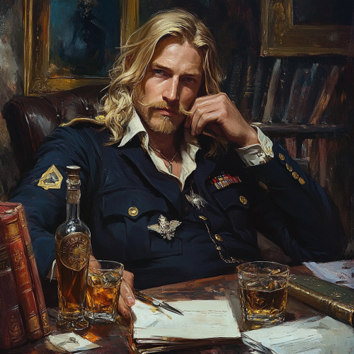 Lovecraftian cosmic horror style portrait of a 30-years old british officer in II World War uniform, blond medium-long hair in chaos, blond mustache, bright eyes, rolled up sleeves, loose top button of shirt, sitting by desk full of papers, books, magazines and a bottle and a glass of whisky. Behing him on the wall hangs an ancient saber from american civil war.