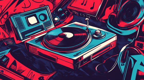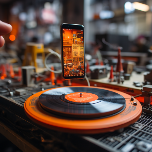 A miniature vinyl record that is placed next to a mobile phone with showcases the live music of the artist and song --s 250