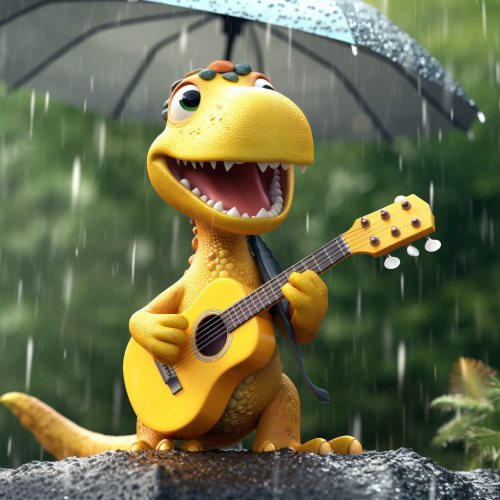 Clay animation, yellow guitar, strong rain, wind and thunder, cute yellow child dinosaur (tyrannosaurus) with big eyes, cute yellow child dinosaur, clay animation, smiling with mouth slightly open, background is heavy rain, strong wind and storm, strong hurricane wind blowing away even umbrella, yellow guitar, --v 5.2