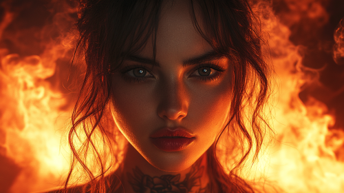 a very beautiful woman representing metal rock music style, wearing metal rock style cloths, wearing tattoos, with red and orange details in the background, smoke, cinematic photography --ar 16:9 --style raw --stylize 750 --v 6.1