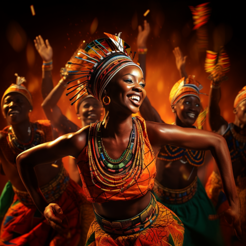 Create a visually striking high-resolution image that vividly captures the essence of African arts and culture. The image should portray the vibrancy and diversity of African traditions, music, dance, and visual arts. Incorporate elements that symbolize unity and understanding, such as people from different backgrounds engaging in African cultural activities together. The image should also highlight the impact of initiatives like concerts, workshops, and educational programs in bringing the world of African arts to the forefront. Ensure that the image exudes warmth, celebration, and a sense of community. It should inspire viewers to appreciate the beauty and cultural significance of African arts while fostering a desire for dialogue and cultural exchange. Feel free to use bold and vibrant colors, intricate patterns, and authentic cultural symbols to enhance the visual storytelling. The final image should be captivating, inviting, and culturally rich, embodying the core mission of the African Arts Institute