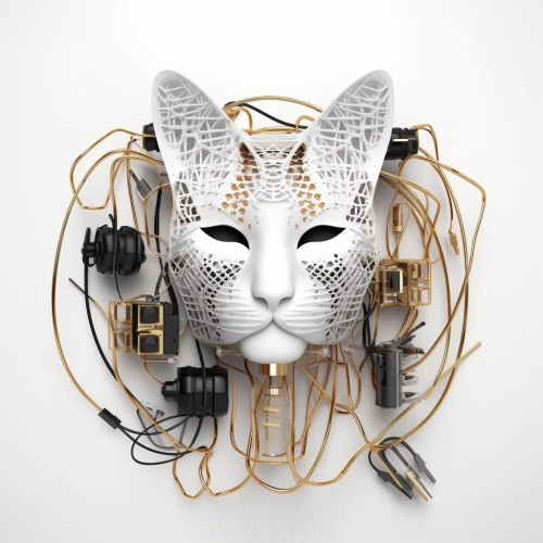 3D cat face made of audio cables and musical instruments and a rorschach aesthetic. white background --v 5.0