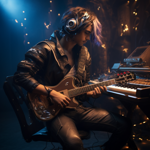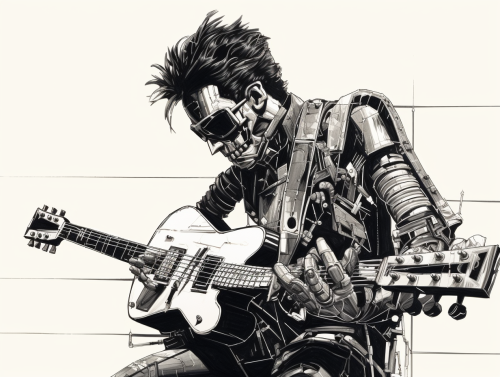 a guitar-playing robot that looks like Elvis presley, in 1980s style, rendered as an amateurish black & white pen & ink sketch --ar 4:3