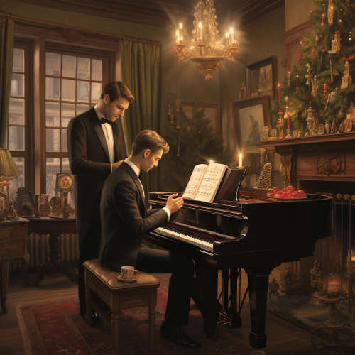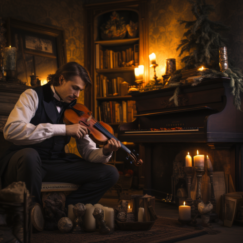 Two men, a violinist playing violin and a pianist playing piano, playing in a small warm European-style room with Christmas candles