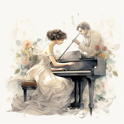 happy mid-age couple seen from behind play piano, on piano there's music sheets