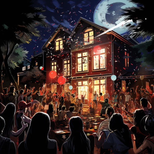 College halloween party, people drinking, inside house, lights off, people dancing to music, Project X movie, ar 1:1 --fast
