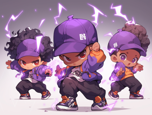 cool kids doing breakdance , hip hop character chibi , energy, electrifying , thunderbolts, purple color palette --ar 4:3 --niji 5