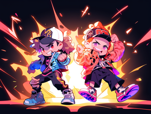 cool kids doing breakdance , hip hop character chibi , energy, electrifying , thunderbolts --ar 4:3 --niji 5