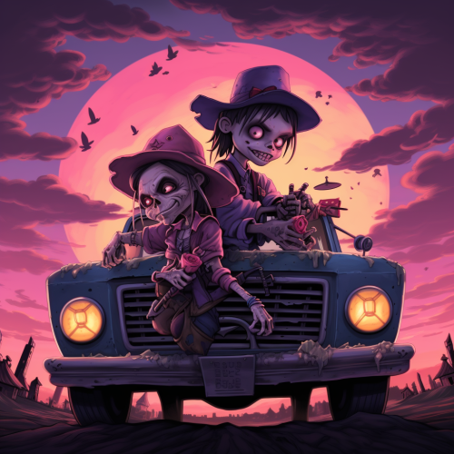 a cute child zombie couple, one is a male guitar player, one is a female wearing a fedora hat and summer dress, both sitting on the front bonnet of a vintage car, selling their souls to the devil at the crossroads, pink, purple, rockstar skinny jeans, van gogh paintings, huncho jack jack huncho album artwork, tim burton, travis scott astroworld, ralph steadman, ultra detailed, oil painting, 8k